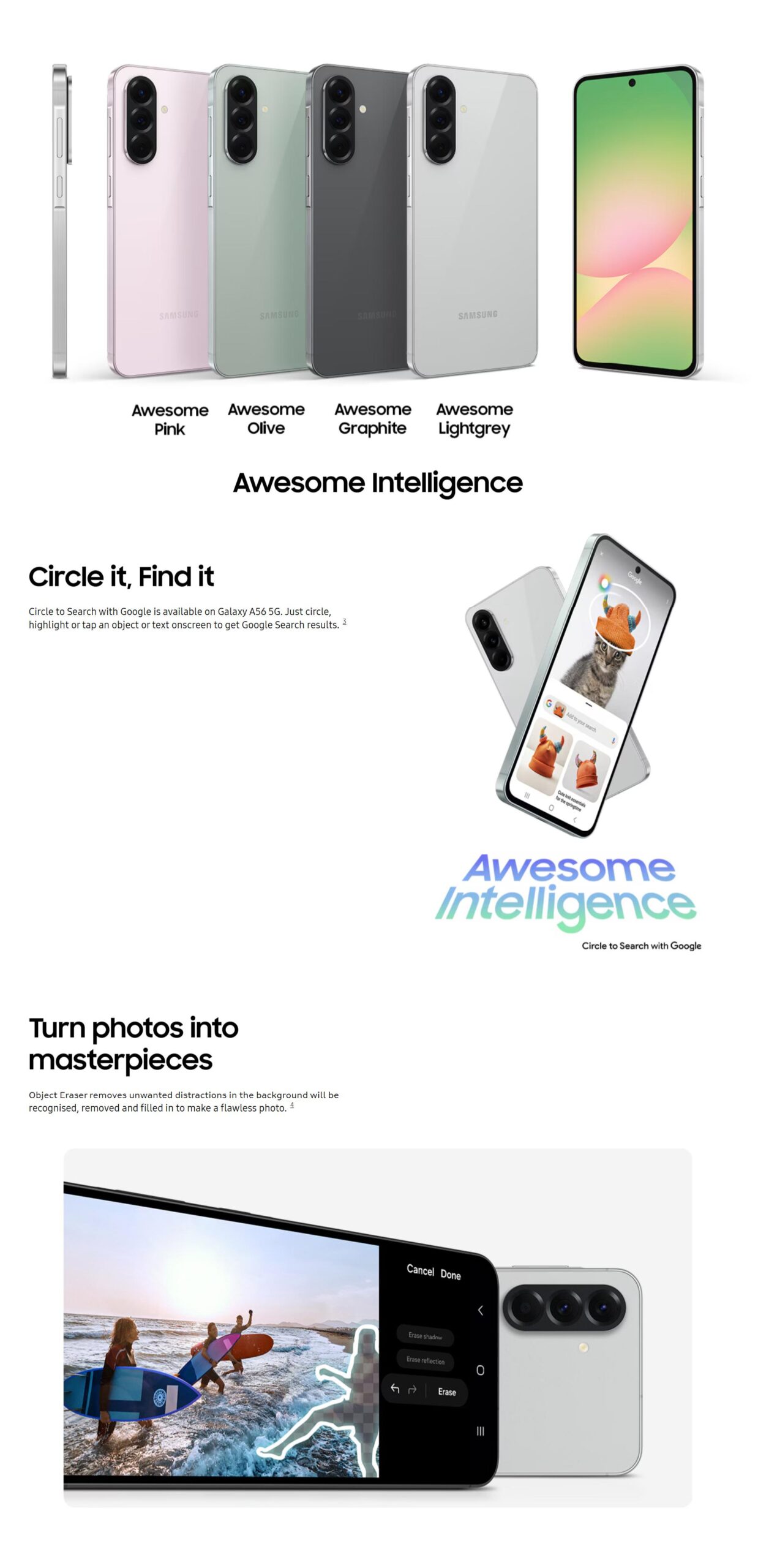 The Samsung Galaxy A56 is a sleek mid-range smartphone offering reliable performance and a modern design. It provides a smooth user experience, long-term software support, and 5G connectivity, making it a solid choice for everyday use.